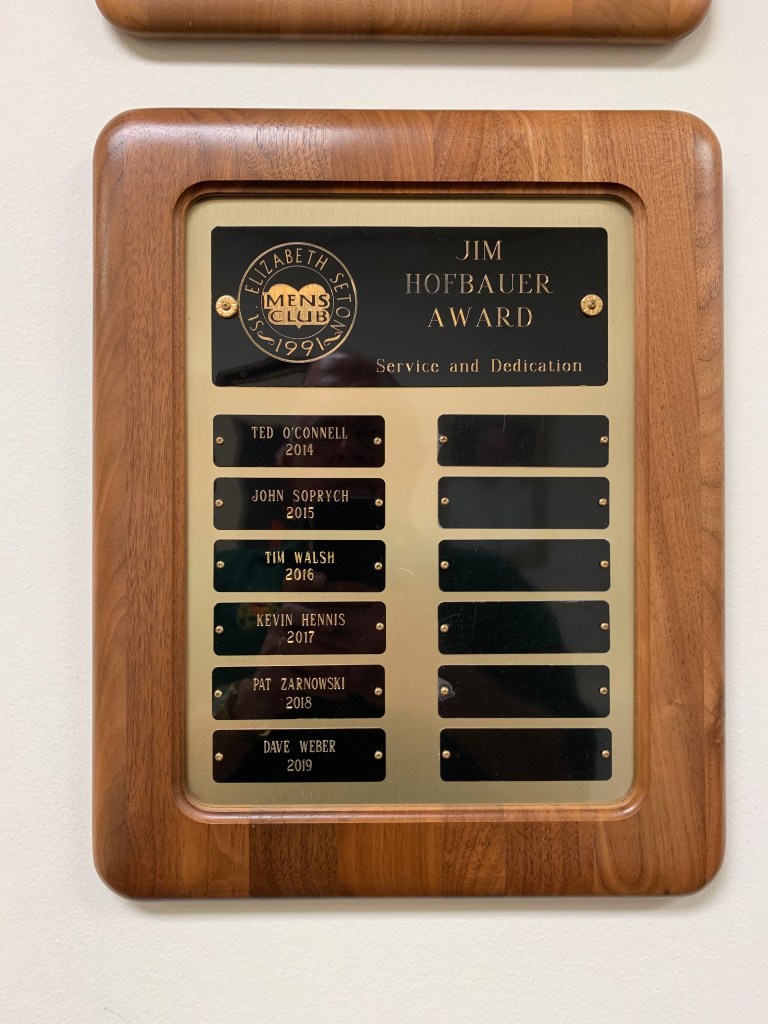 At the end-of-year meeting held in May 2019 The Saint Elizabeth Seton Men’s Club honored a member of our club for his dedication to and support of our club. The 2010 Jim Hofbauer Award was presented to Dave Weber. His wife, Linda was present for the ceremony. The presentation was made by 2018-2019 President Mike Johnston.